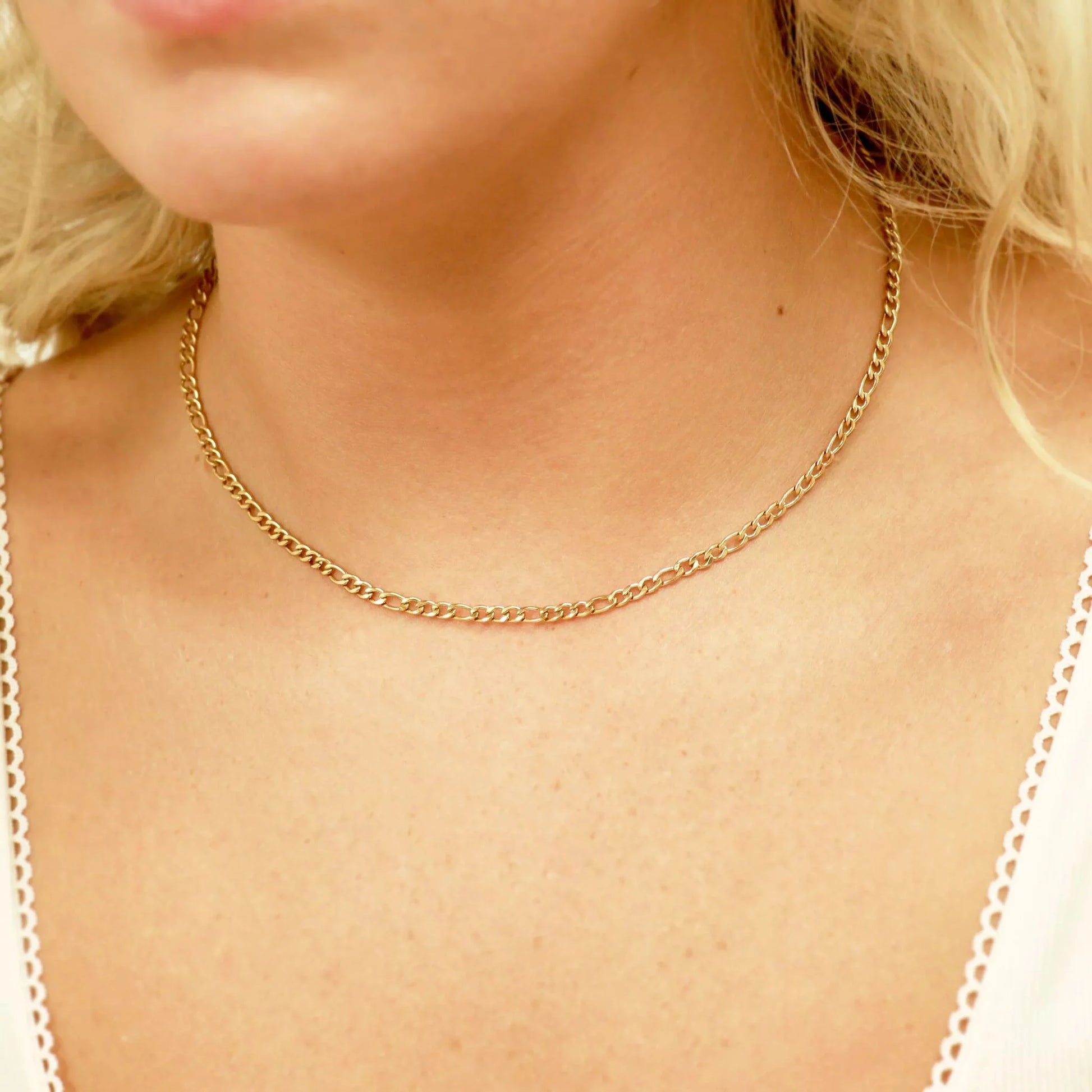 Looking for a bold, versatile statement piece to add to your jewelry collection? Well, look no further! This stunning necklace features a figaro chain design, PVD coated in a gleaming 18K gold, with a lobster-claw clasp to give you a comfortable and secure fit. The popular figaro chain design is timeless and looks great with any outfit and with the flat construction will lay smoothly against the chest. So whether you're dressing up for a special occasion or just want to add a little something extra to your everyday look, this necklace is the perfect choice for you!