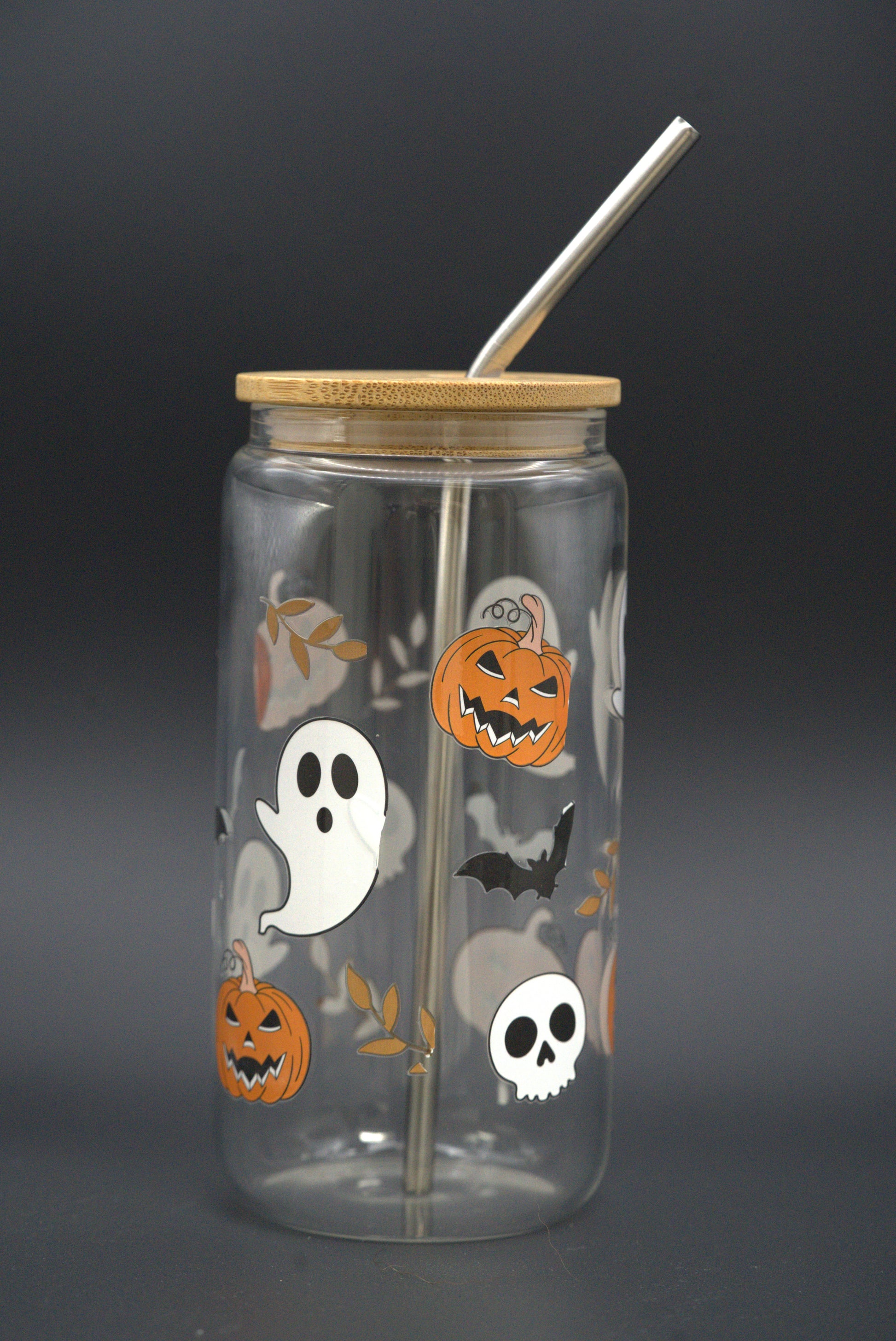 Sip your favorite drinks in spooky style with this Halloween-themed glass tumbler. Featuring a festive design of smiling pumpkins, playful ghosts, bats, and skulls, this clear glass cup is perfect for seasonal fun. The eco-friendly bamboo lid and reusable stainless steel straw make it a sustainable choice for everyday use. Whether you’re enjoying iced coffee, tea, or a festive fall beverage, this tumbler adds a touch of Halloween charm to every sip. Durable and reusable, it’s ideal for home, work, or on-the-go celebrations. A must-have accessory for anyone who loves Halloween vibes all year round!
