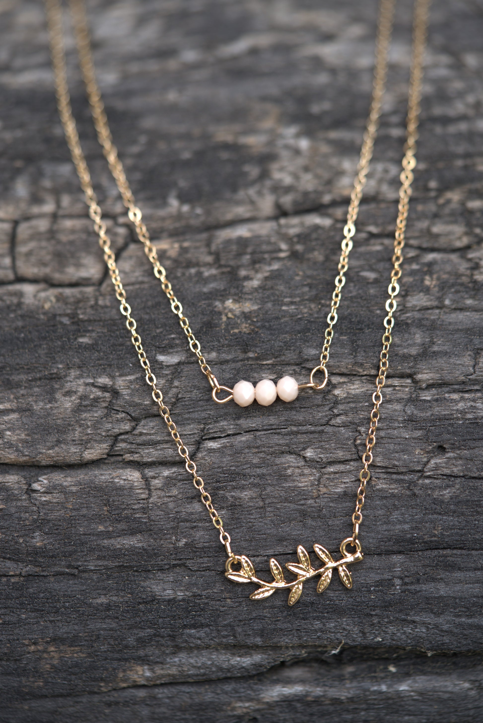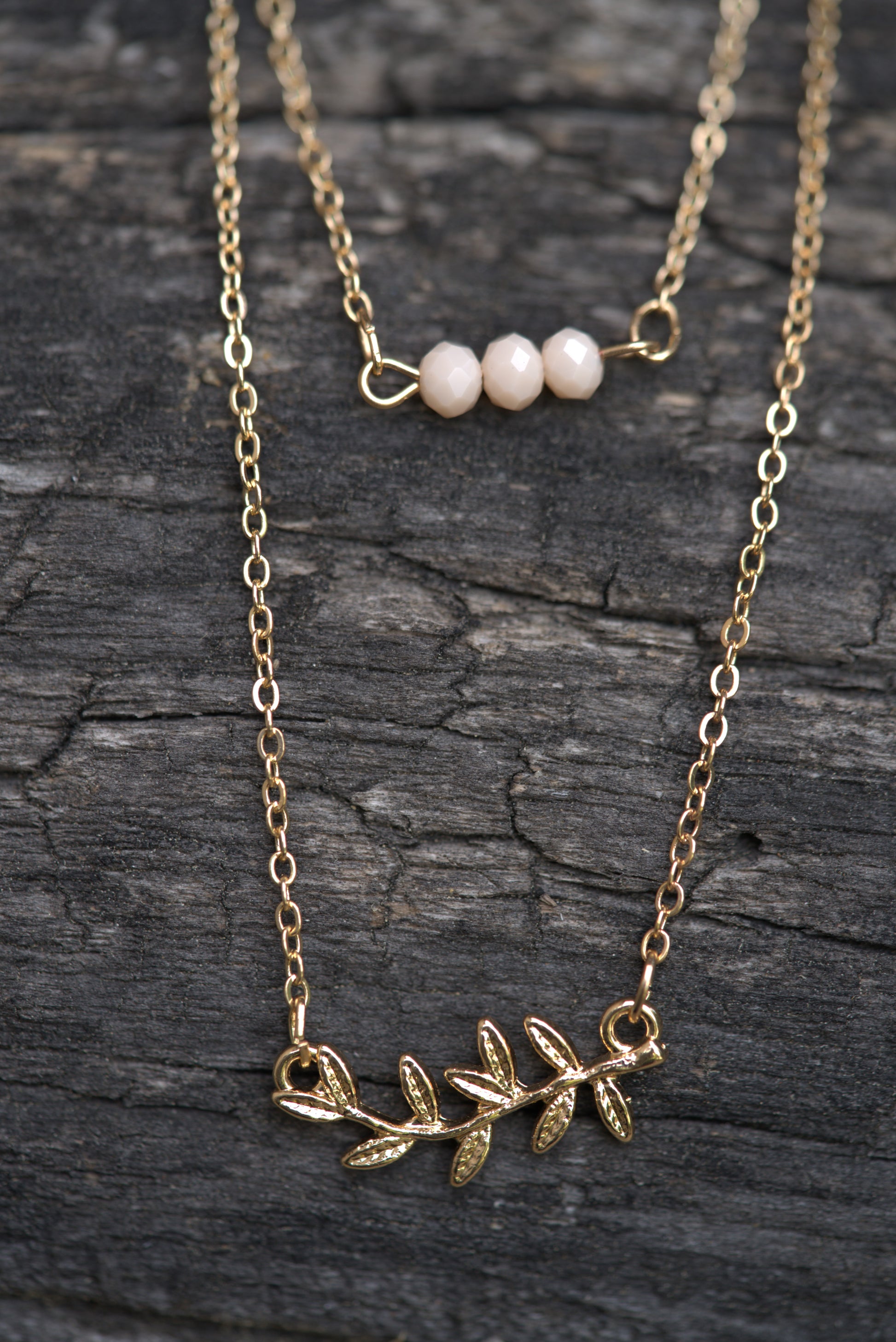Add a touch of nature-inspired elegance to your jewelry collection with this gold layered necklace. Designed with two delicate chains, the top layer showcases a trio of soft cream faceted beads for subtle sparkle, while the bottom layer features a detailed gold leaf branch pendant that exudes timeless charm. Lightweight and versatile, this necklace can be worn solo for a refined minimalist look or layered with other favorites for a trendy, stacked style. Perfect for both everyday wear and special occasions, it makes a thoughtful gift or a chic statement piece for your own collection.