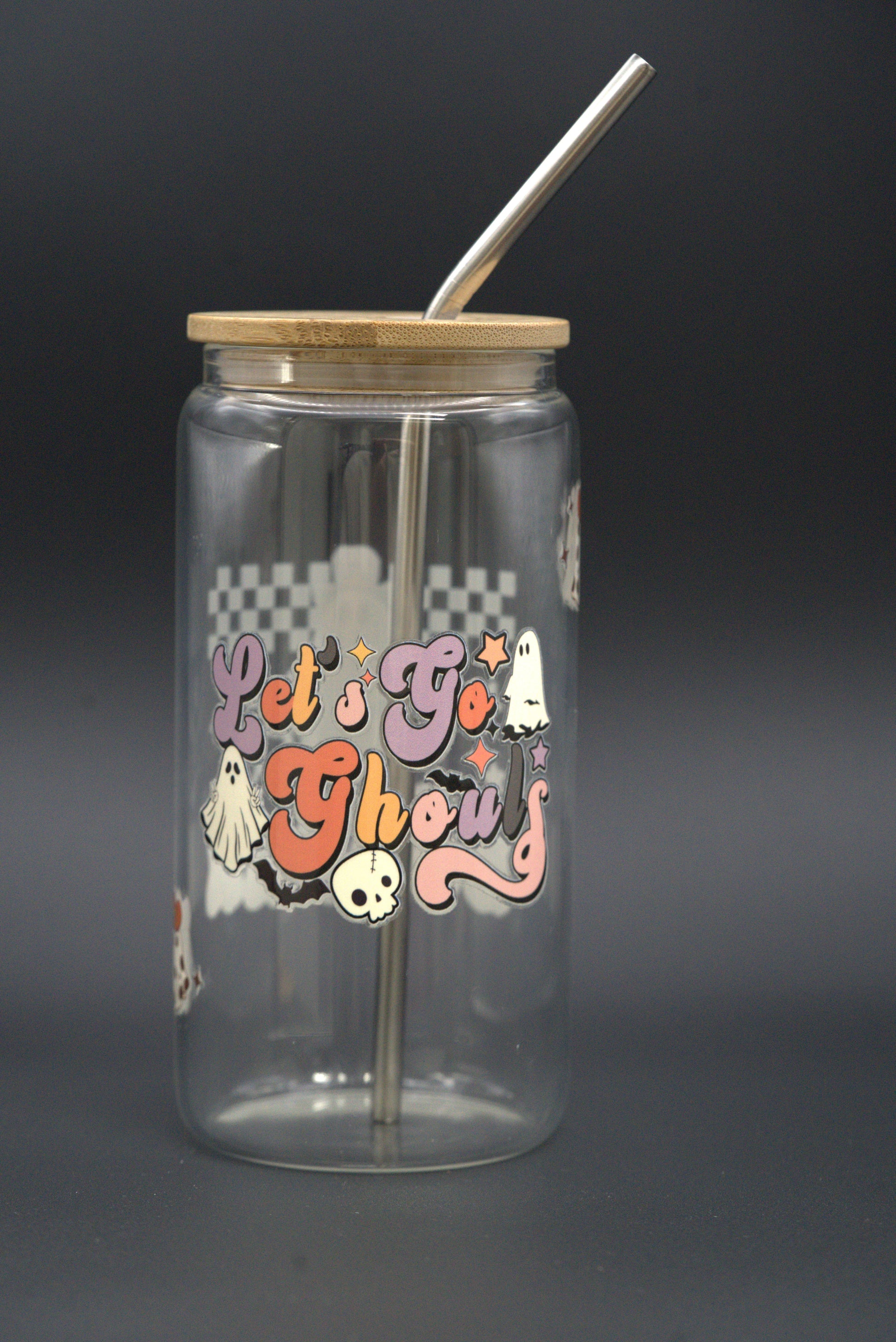 Sip in spooky style with the Let’s Go Ghouls Halloween Glass Can Tumbler! 🎃👻 This 16oz reusable tumbler features a fun retro-inspired design with playful ghosts, pastel lettering, and cute skull accents that bring the Halloween spirit to every drink. The durable clear glass body pairs perfectly with a natural bamboo lid and stainless steel straw, making it both eco-friendly and stylish.