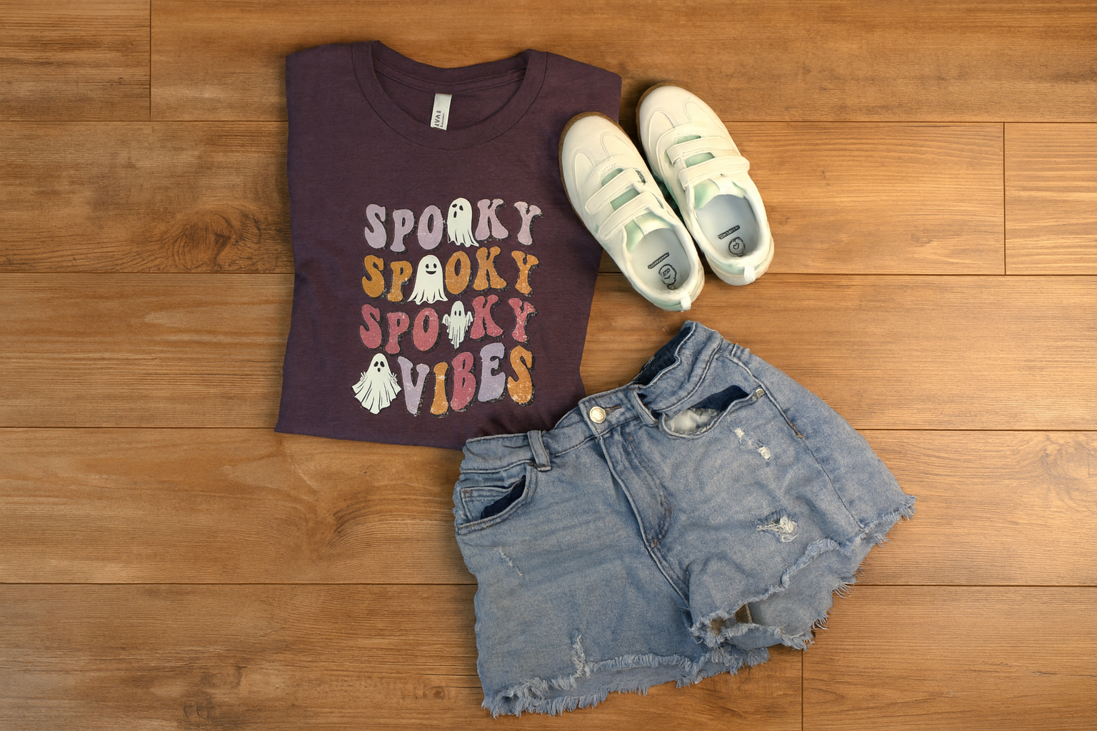 Celebrate spooky season in style with this Spooky Vibes Halloween graphic tee. Made from a soft, breathable cotton blend, this shirt offers all-day comfort while showing off your festive side. The deep purple backdrop is decorated with playful ghost illustrations and bold retro lettering in fall-inspired shades of orange, yellow, and pink that read Spooky Spooky Spooky Vibes. Designed with a classic crew neckline and short sleeves, it pairs effortlessly with jeans, shorts, or leggings, making it the perfect go-to top for pumpkin patch trips, Halloween parties, or cozy nights at home. Fun, stylish, and seasonal—this tee is a must-have for your fall wardrobe.