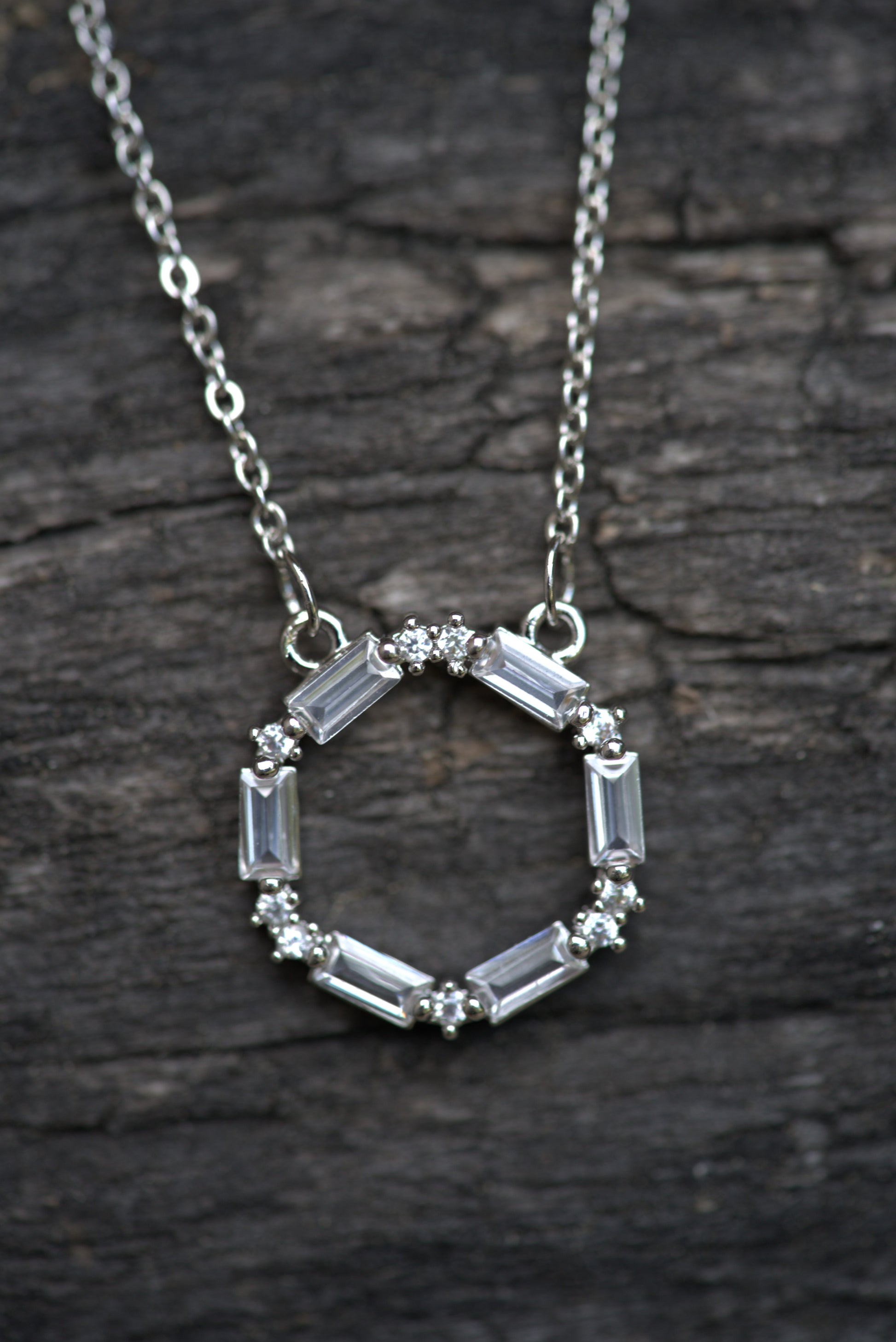 Stainless Steel Circle Necklace with Baguette and Round Cubic Zirconia Stones