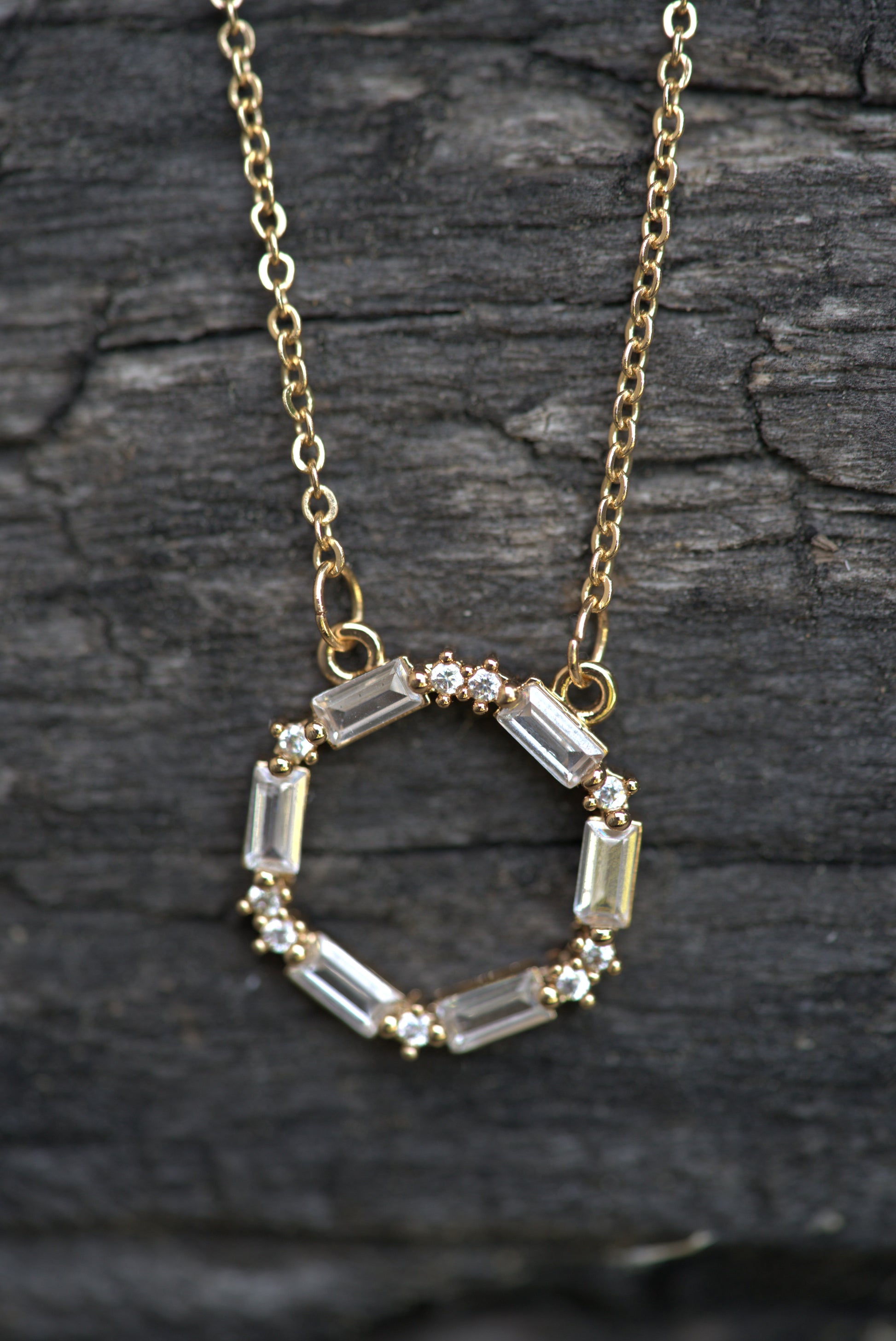 This elegant stainless steel circle necklace features a modern open-circle pendant adorned with alternating baguette-cut and round brilliant cubic zirconia stones. The geometric baguette cuts create a sleek, contemporary look, while the round stones add sparkle and timeless charm. Set on a delicate stainless steel chain, this necklace is versatile enough for everyday wear yet striking enough to elevate any evening ensemble. With options of stainless steel, gold plated, or rose gold plated, there are options for all!